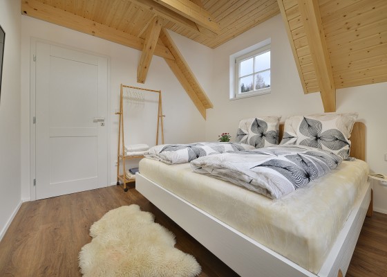 Postel Mamma od JITONY s rozměry 180 x 200 a matrací z líné pěny Vám poskytne příjemný spánek. Povlečení z mikroflanelu. V pokoji je stylový štendr s úložným prostorem. LG Smart TV s Netflixem, Apple TV. Možnost dětské postýlky. Vinylová podlaha. Stmívací světla na dálkové ovládání. V koupelně v patře: fén, walk in sprcha s obrovskou hlavicí Hansgrohe, luxusní koupelnová kosmetika L´Occitane, umyvadlo, WC s bidetem Villeroy & Boch.