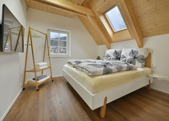 Postel Mamma od JITONY s rozměry 180 x 200 a matrací z líné pěny Vám poskytne příjemný spánek. Povlečení z mikroflanelu. V pokoji je stylový štendr s úložným prostorem. LG Smart TV s Netflixem, Apple TV. Možnost dětské postýlky. Vinylová podlaha. Stmívací světla na dálkové ovládání. V koupelně v patře: fén, walk in sprcha s obrovskou hlavicí Hansgrohe, luxusní koupelnová kosmetika L´Occitane, umyvadlo, WC s bidetem Villeroy & Boch.
